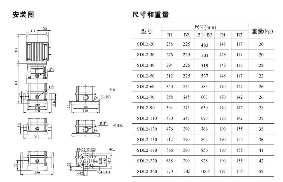 SDL2/SDLT2為配用標準電機的非自吸立式多級離心泵,電機軸和泵軸用聯軸器直接聯接,把拉桿用螺母將外筒,過流部件固定在支架和進出水體之間,泵進出水口在泵底部的同一直線上。泵可根據需要配置智能保護器,對泵的干轉、缺相、過載等進行有效的保護。