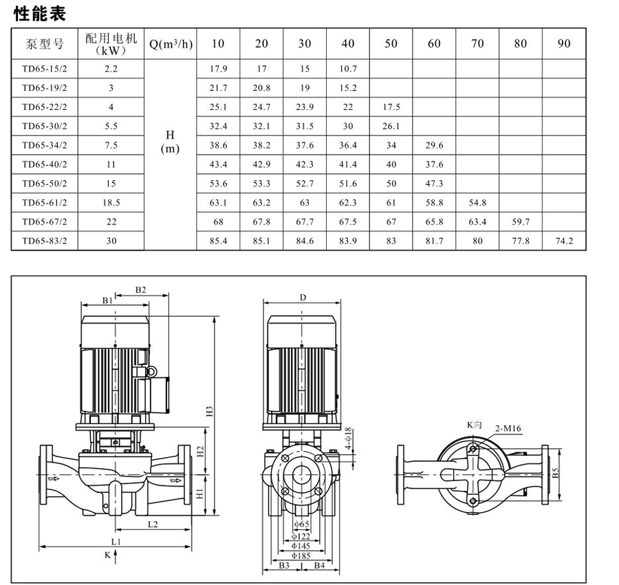 TD65系列單級管道離心泵,配有標準電 機和機械密封。此類產品的結構與相近類型產品相比,更不易受到泵送液體中雜質的影響。產品設計為頂部可拉出的拆裝形式,其可 以在不影響管路系統的情況下對泵進行維修。所有泵采用創新式便拆式機械密封,更好機械密封無需拆卸電機。